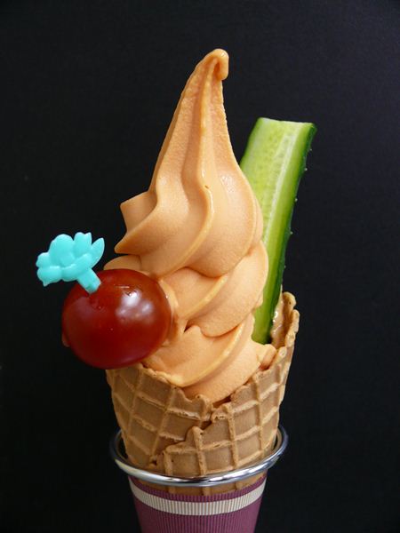 トッピングされたきゅうりとミニトマトにちょっとびっくり!? トマトジュースベースのソフトクリームは赤城高原のさわやかな高原らしさをイメージしているそう。さっぱりとした甘みの中にトマトの香りが広がって、サラダ感覚で楽しめます。