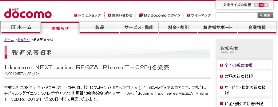 ・報道発表資料 : 「docomo NEXT series REGZA Phone T−02D」を発売 | お知らせ | NTTドコモ