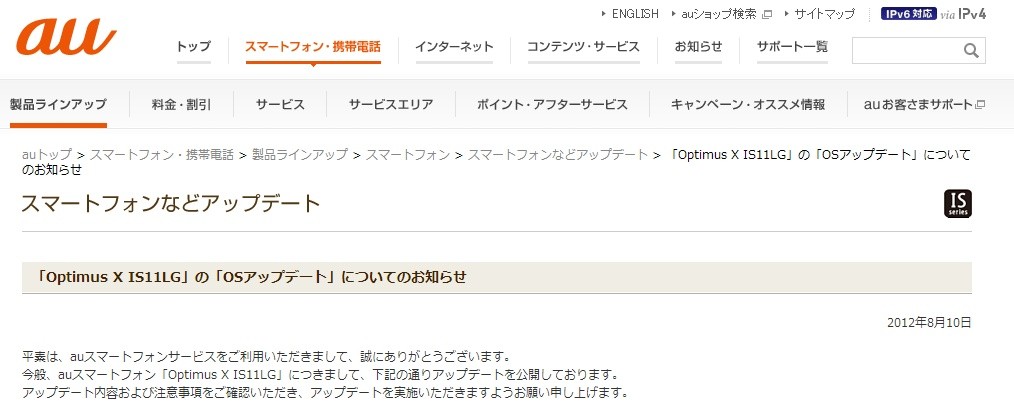 ・「Optimus X IS11LG」の「OSアップデート」についてのお知らせ | スマートフォンなどアップデート | au
