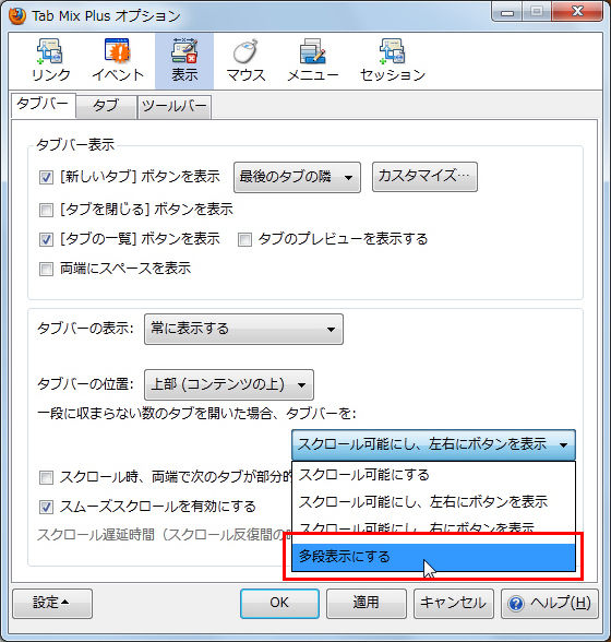 [表示]で[一段に収まらない数のタブを開いた場合、タブバーを]で[多段表示にする]に設定すれば(画面5)、たくさんのタブを開いたときにタブバーが複数段表示され、左右にスクロールする必要が無くなる。