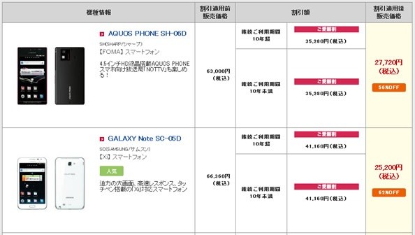 NTTドコモは18日、割引サービス「デビュー割」および「ご愛顧割」の対象機種を拡大し、GALAXY Noteなど6機種を新しく追加したことをお知らせしています。対象機種において、毎月一定額が割引される「月々サポート」は適用されなくなりますが、その分一括購入時の価格が大幅に値下げされています。