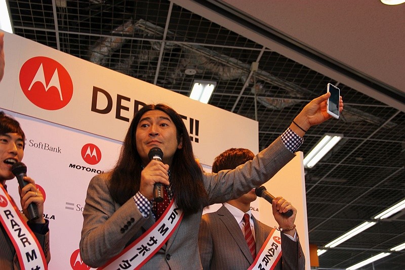 ソフトバンクモバイルとモトローラ・モビリティ・ジャパンは26日、同日に発売開始されたTD-LTEに完全互換性があるとされる超高速通信規格「AXGP」によるデータ通信サービス「SoftBank 4G」に対応したAndroidスマートフォン「RAZR M 201M」(モトローラ・モビリティ製)の発売を記念したイベントをLABI渋谷の1F店頭スペースにて開催しました。