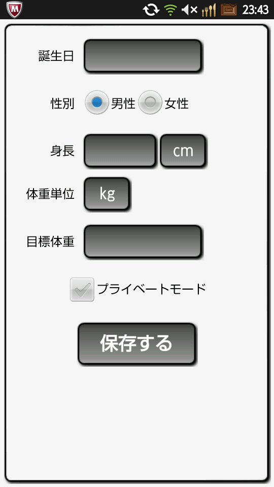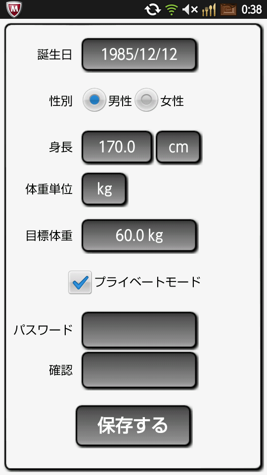 [BMI計算]のタブでは身長・誕生日・体重・性別を入力してBMI(肥満度)・BMR(基礎代謝)の計算ができるようになっています。
