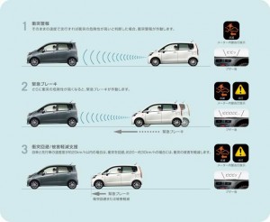 軽自動車のコスト感覚に合わせて、必要な安全性能を現実的な価格(5万円)で実現できるように、30km/h以下での衝突回避支援に絞っています。