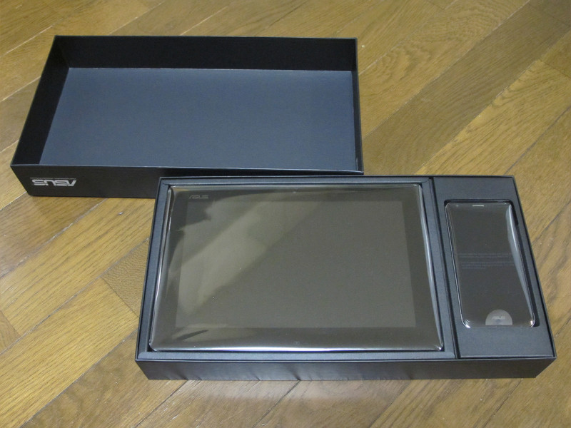 上蓋を持ち上げるとスマートフォン本体の「PadFone 2」とタブレット型ドックの「PadFone 2 Station」が現れます。両方共、プラ製の保護シートに包まれています。
