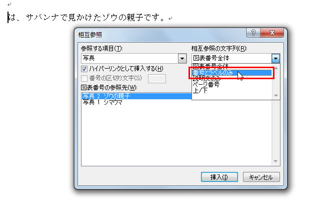 [参照する項目]で図表番号の項目を選択し、[相互参照の文字列]を選択する。ここでは、番号とラベルだけを挿入したいので、[番号とラベルのみ]を選択した(画面2)。