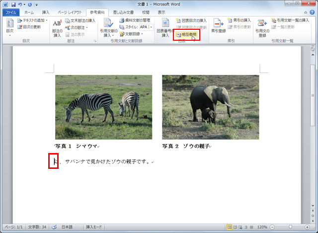 相互参照を挿入したい位置にカーソルを移動し、[参考資料]タブの[相互参照]をクリックする(画面1)。