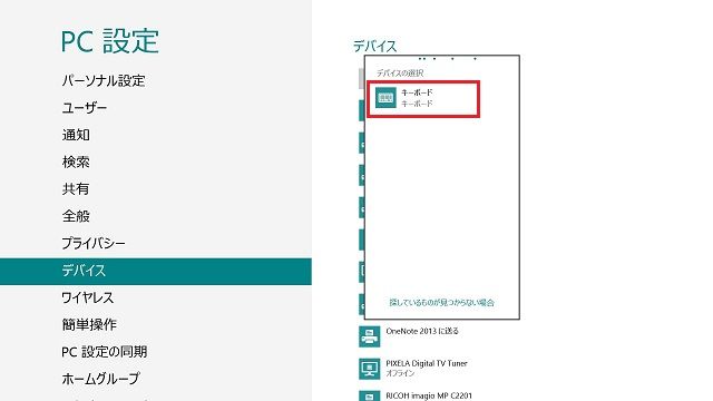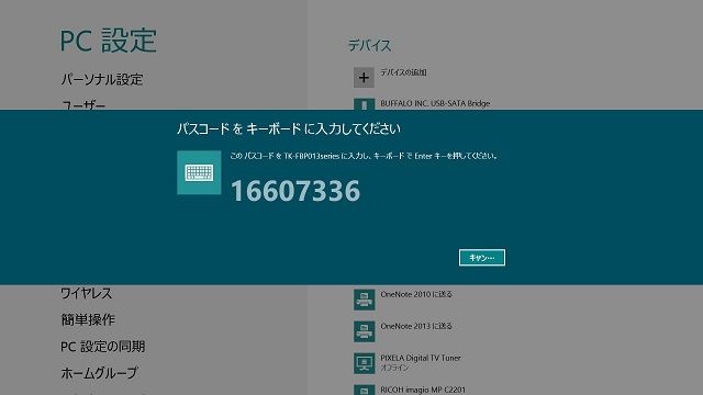 Bluetoothキーボードを利用するには、PC設定のデバイスから、新たなデバイスとして接続する。Bluetoothでは、機器を1対1で対応させる「ペアリング」を行う必要がある。キーボードの場合、その都度発行されるパスコードを入力することになる。