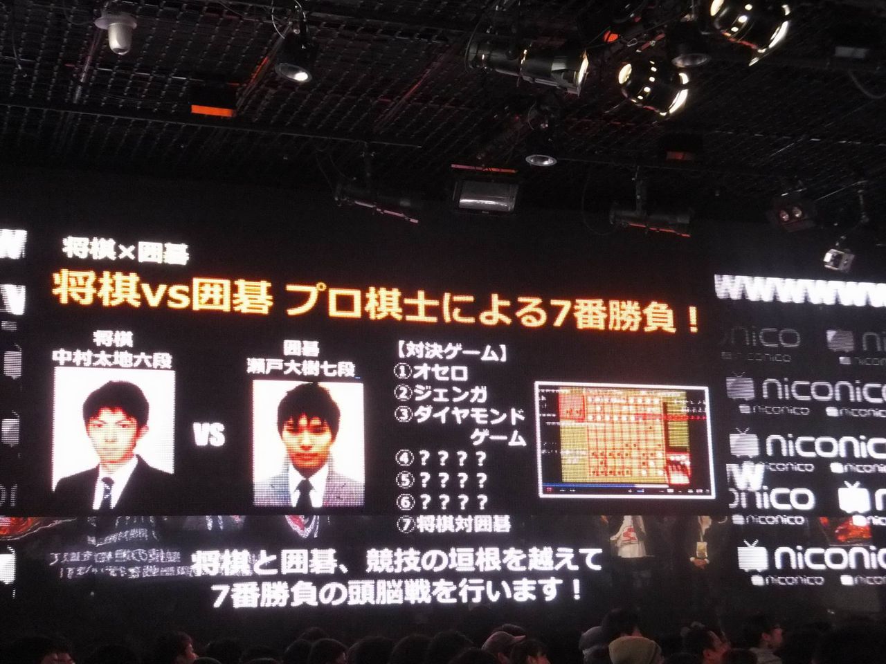 将棋界から中村太地六段、囲碁界から瀬戸大樹七段が出場し、競技の垣根を越えて7番勝負の頭脳戦を実施。対決ゲームはオセロ、ジェンガ、ダイヤモンドゲームのほか、ニコニコ動画に投稿され話題となった将棋vs囲碁対決を行う。