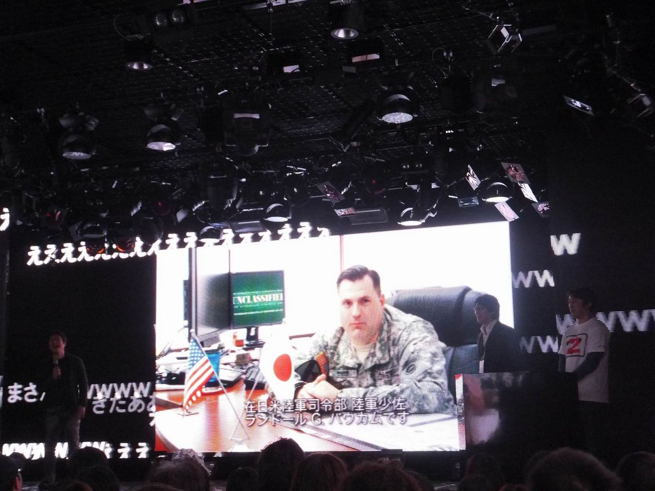 自衛隊の参加に続き、在日米陸軍もニコニコ超会議2にブース出展することが決定。「Operation TOMODACHI」関連のパネル展示のほか、「自衛隊音楽まつり」でも人気の高い「在日米陸軍軍楽隊」が来場し、会場でブラスバンド演奏とロックバンド演奏を行う。また、自衛隊と在日米陸軍の隊員が「超2525(ニコニコ)中隊」を特別結成。「超2525中隊」は、ブースに来た来場者を総称した隊で、すべての来場者が笑顔になることを目的とした作戦「Operation Nico×Nico」を発動。会場では、自衛隊・在日米陸軍ブース作戦パッチ風ステッカー(2枚1組)を両日とも先着5000枚、来場者に無料配布する。