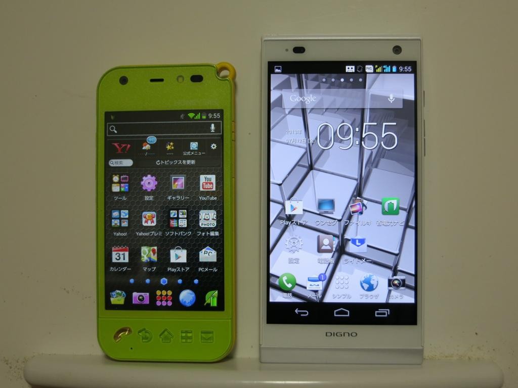 ほぼ同じようなサイズですが、DIGNO DUAL 2 WX10Kはホームボタンなどがオンスクリーンボタン(画面上に表示するボタン)であるのに対し、Optimus it L-05Eは静電タッチキーながらハードキーになっているので、Optimus it L-05Eががんばっているなというところでしょうか。