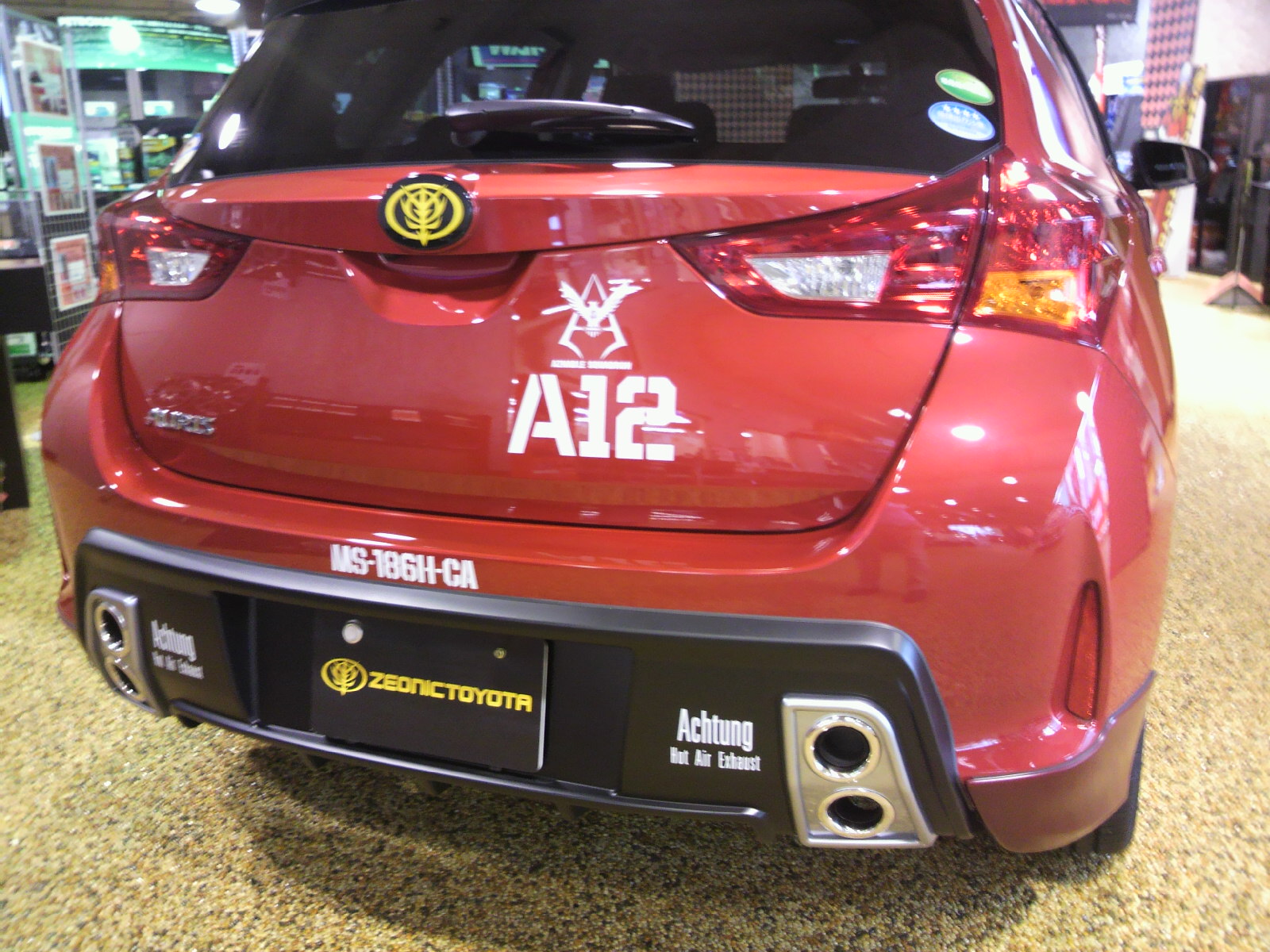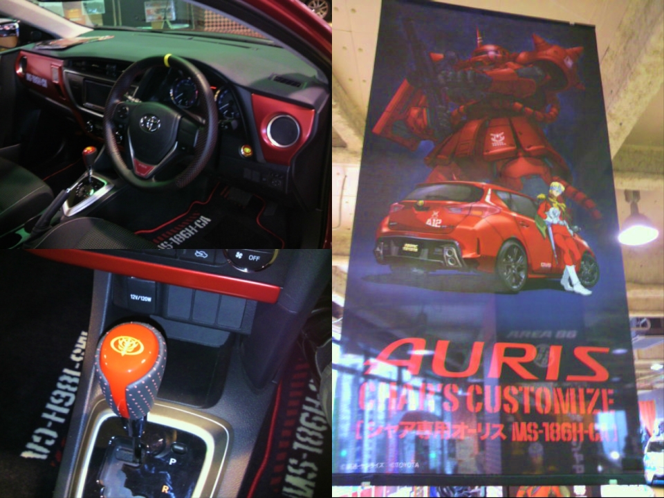 セールスさんも初代ガンダム世代で、大いに話が盛り上がりました。気になるお値段を聞いたところ、エアロパーツ、アルミ+タイヤ、専用ナビ、ステアリング・アンテナ・フロアマット等で100万円の大台を突破するとのこと。一瞬びっくりしましたが、エアロとナビだけでも50万を突破するから、確かにそうなりますよね。でもシャア専用パーツは、作り手の本気度というか、ガンダムもシャアも好きで堪らないという熱意がヒシヒシと伝わってくるものでした。また屋根のカーボン調シートは、HUB PORT若林店独自のこだわりで実現したものですから、売り手の本気度もハンパじゃありません。シャア専用オーリス、ガンダムファンには必見ですぞ〜。