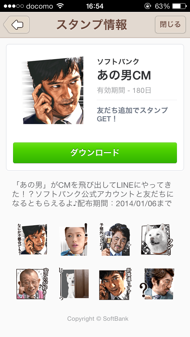 「あの男」がCMを飛び出してLINEにやってきた!?ソフトバンクスタンプの第6弾は、現在放送中のテレビコマーシャルから、堺雅人さん、市村正親さん、笑福亭鶴瓶さん、そしておなじみ上戸彩さんとお父さんが登場という豪華なラインナップです♪ 臨場感溢れるスタンプは必見です!