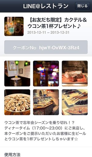 QRコードやLINE IDを使わなくてもそのお店のLINE@アカウントを手軽に見つけることができ、友だちに追加すれば、以下のようなお店の最新メニューやセール情報などをゲットできるかもしれないということです。