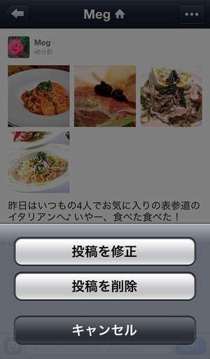加えて、タイムラインの投稿文の編集が可能になっています。これは、タイムラインに投稿した文章を後から編集できるもので、画像やスタンプなどではなくテキスト文章のみが編集可能となります。自分の投稿を表示させ、メニューボタンから「投稿を修正」を選べば文章を編集できます。