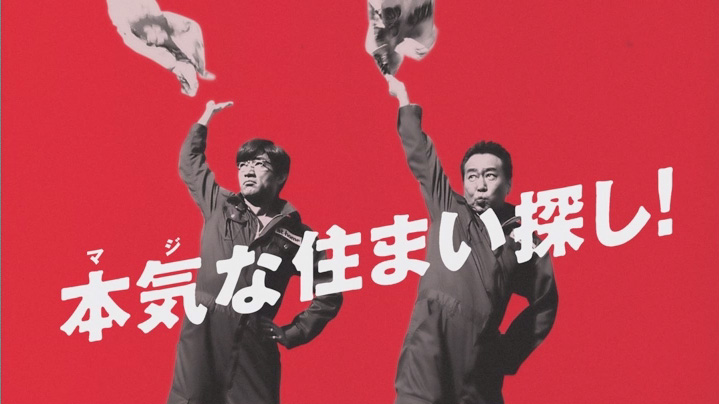 TVCMでは、いつになく真剣な表情の「さまぁ〜ず」の二人が、アロハシャツを脱ぎ捨てて真っ赤なウェアに変身し、CM 特製の車に乗り込んで、理想の住まいを探している人たちの「本気(マジ)な住まい探しを手伝いに向かいます。