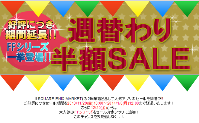 スクウェア・エニックス(以下、スクエニ)が展開するAndroid向けアプリ配信マーケット「SQUARE ENIX Market」の2周年記念キャンペーンが期間延長されました。第4週目のセールが本日12月20日(金)から2014年1月6日(月)までの期間で実施中です。