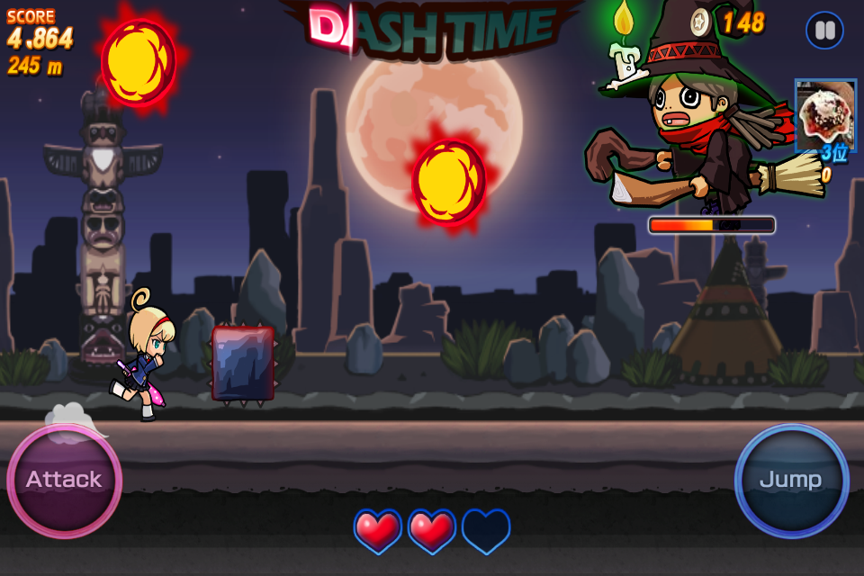 操作方法は、走り続ける主人公のタイミングに合わせて、画面右側のボタンをタップするとキャラクターがジャンプし、左側のボタンをタップするとキャラクターが敵に攻撃をします。