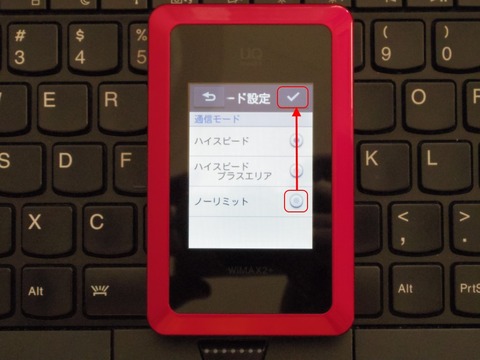 今回はノーリミットモードに切り替えるので、「ノーリミット」のところを選択します。その後、右上のチェックマークをタップすると切替が完了します。つい、Androidスマホ・タブレットのUIの癖で選択が終わると即切り替え開始だと思ってしまい、チェックマークのタップを何度も忘れて“切り替わらない、切り替わらないよおおおおお”と戸惑っていたのは内緒です。チェックマークをタップするのを忘れないようにしましょう。