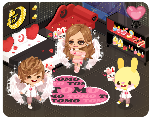 板野友美さんの世界観を再現したアバターやファッション、黒を基調に赤やピンクのハートをモチーフにした家具などのインテリアのルームとなっています。