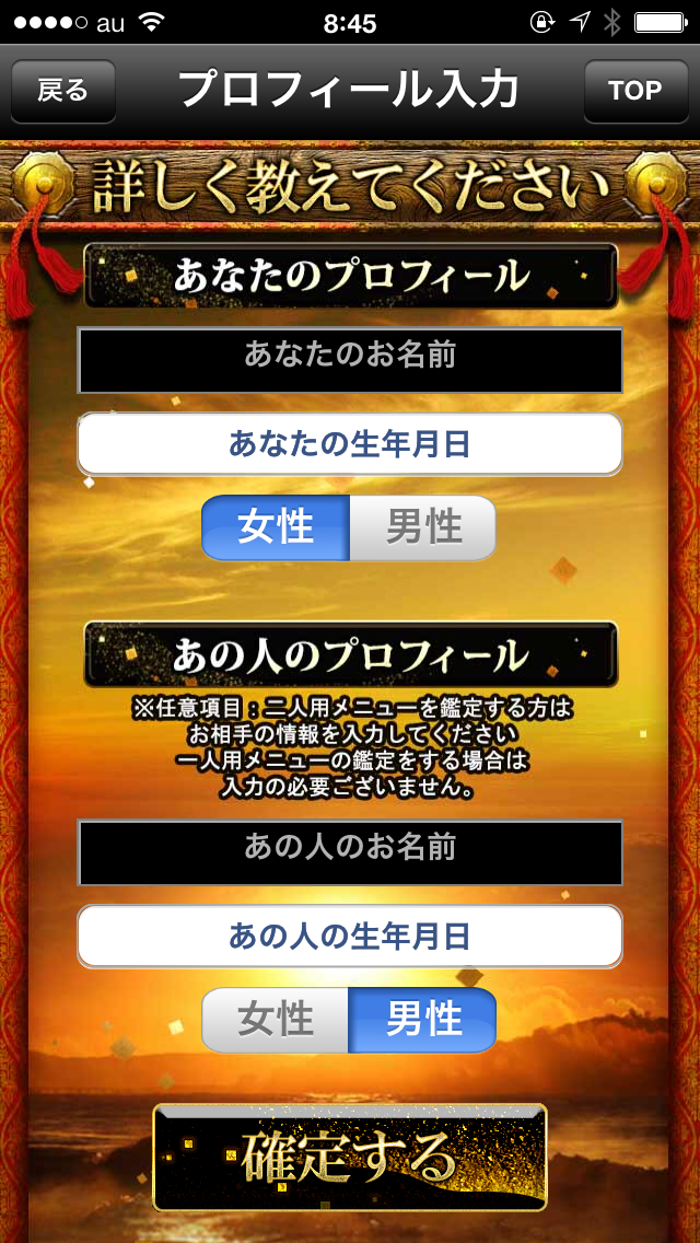 プロフィールを入力して「鑑定する」をタップします。結婚運や恋愛運なども占いたい場合に、その相手がわかっているなら相手のプロフィールも入力しておきましょう。