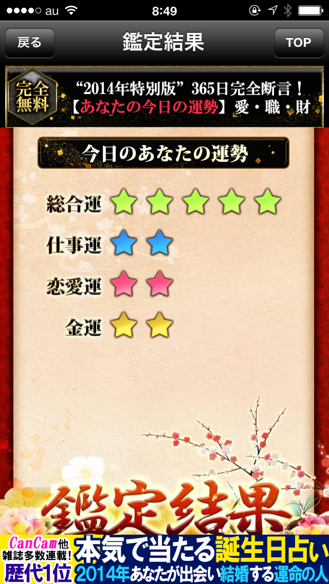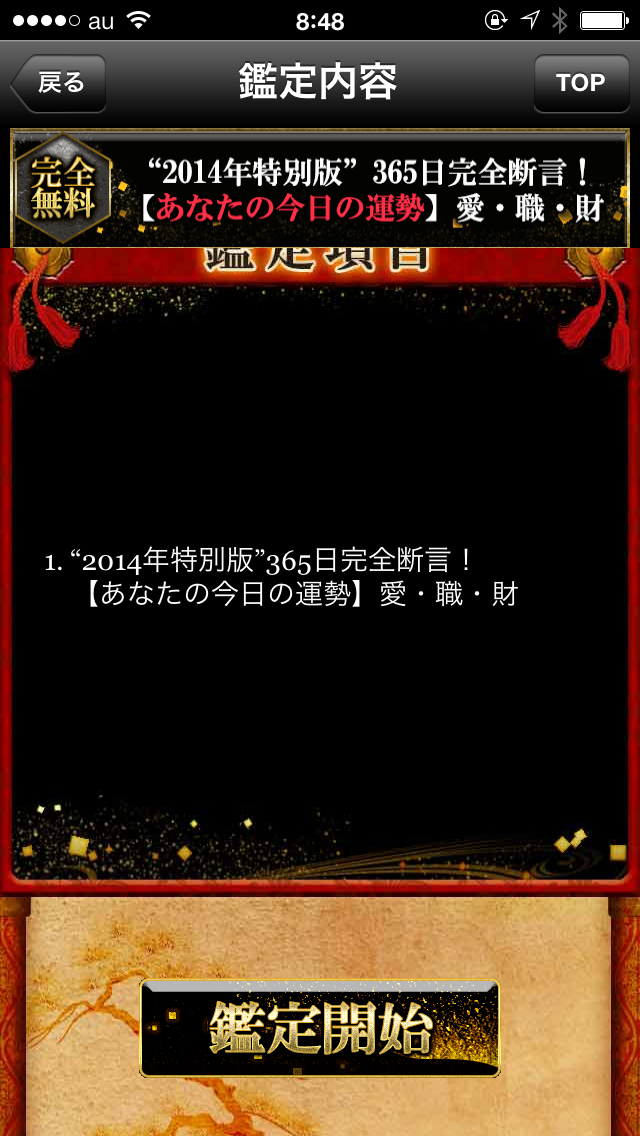 例えば、一番上にある「“2014年特別版” 365日完全断言!あなたの今日の運勢」を選ぶと、脇田尚揮氏による占いが閲覧できます。少し下にスクロールして「鑑定開始」をタップします。