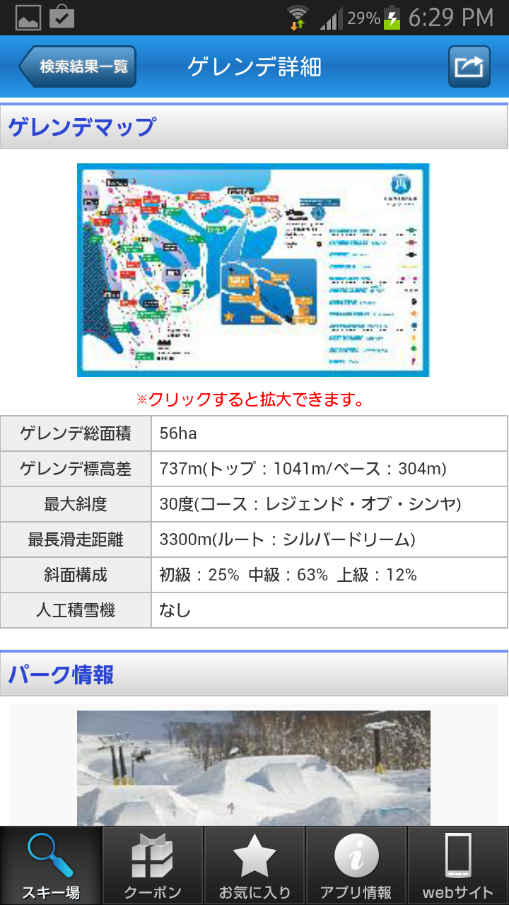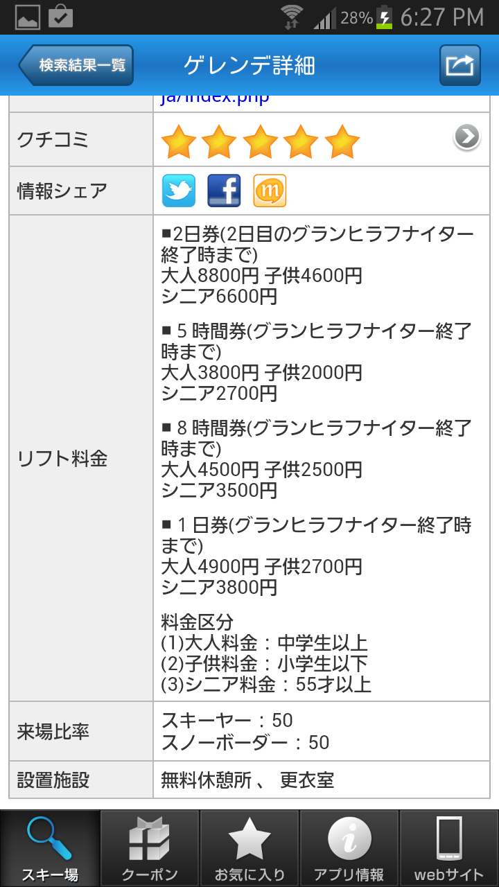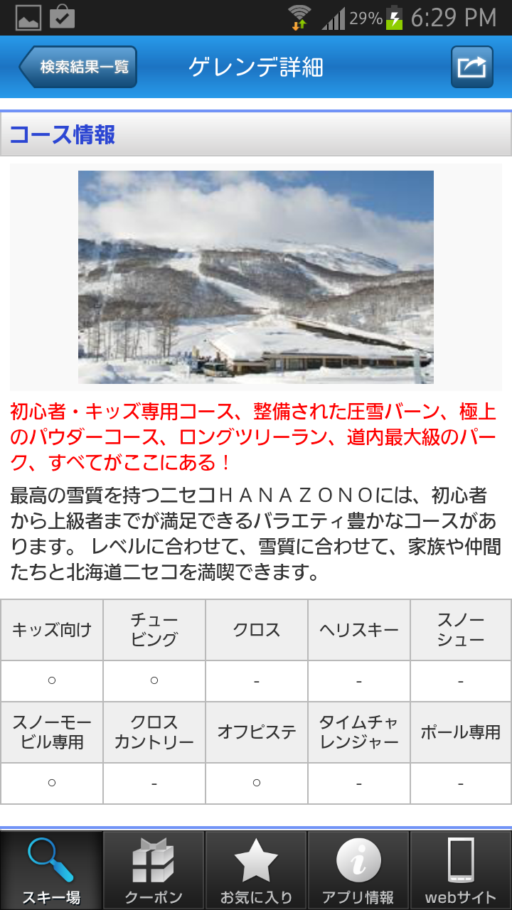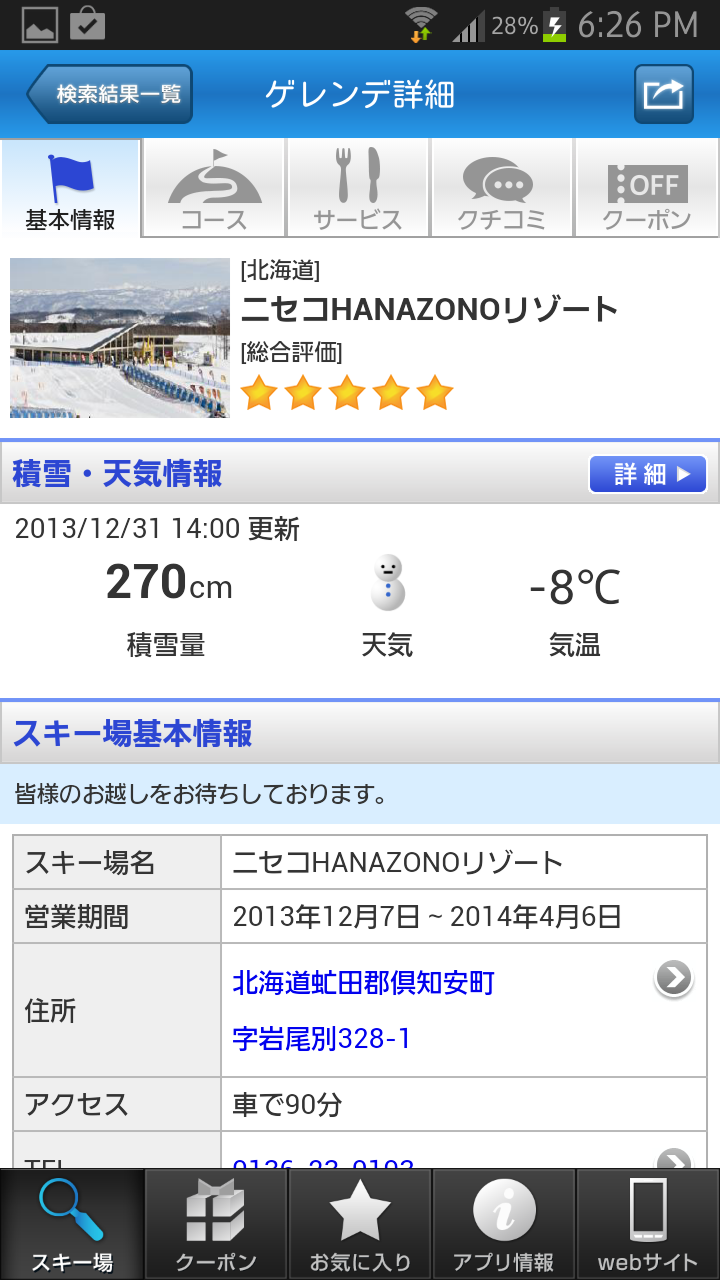 ゲレンデ情報では、「基本情報」「コース」「サービス」「クチコミ」「クーポン」の5つのカテゴリに分かれているので知りたい情報を素早くチェックすることができます。