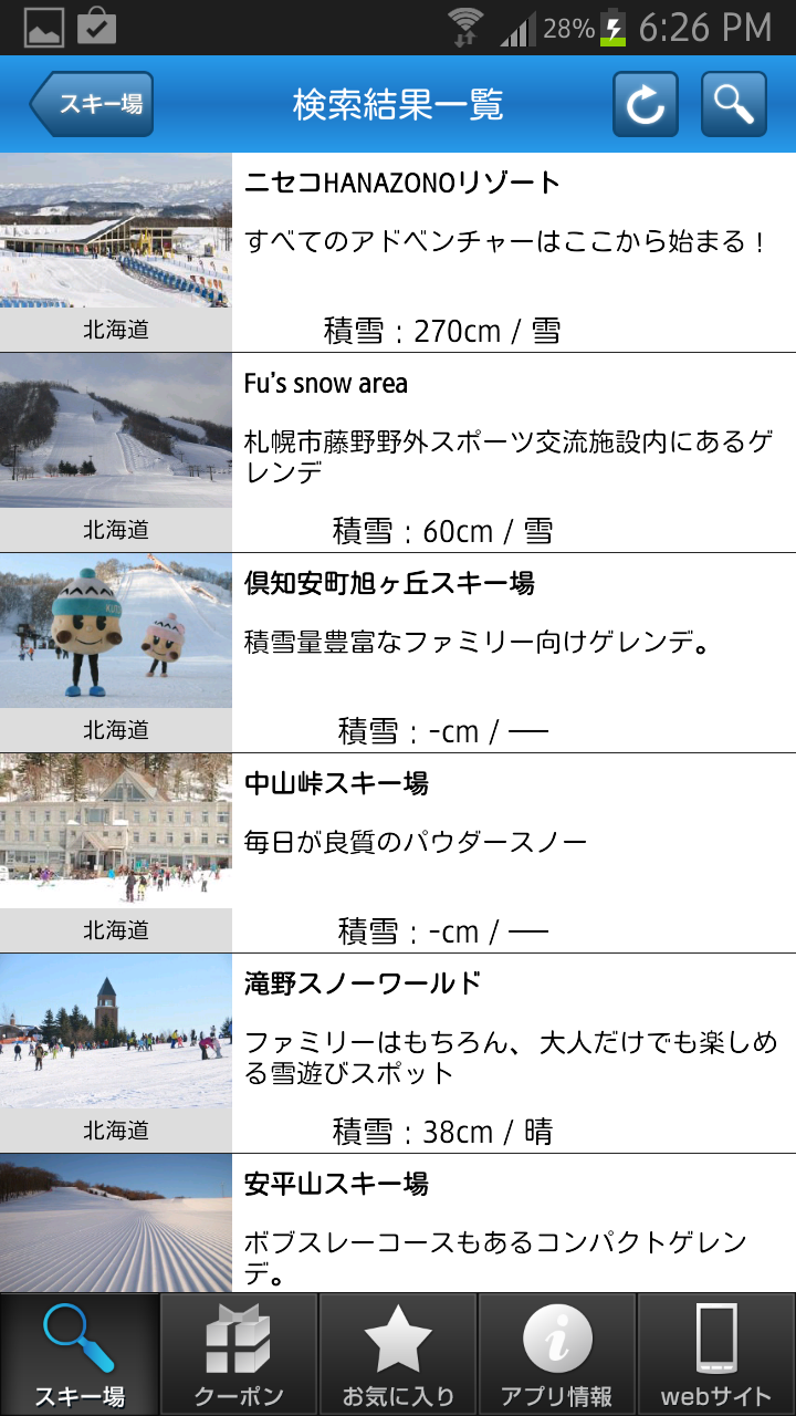 検索結果では、スキー場名と積雪、天候を写真付きの画面で表示してくれます。