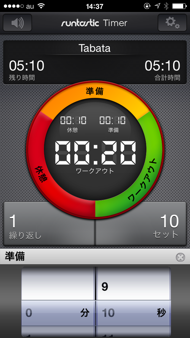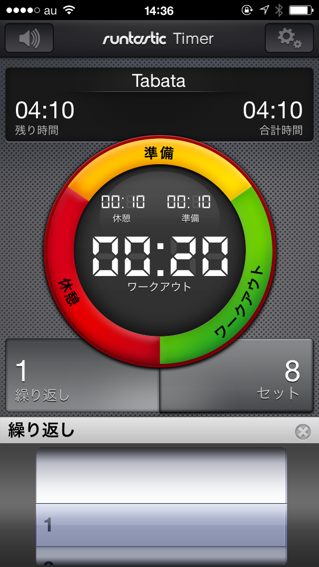 起動すると中央にタイマーの数字が記載されており、その周りに“リング”のように「準備」や「ワークアウト」、「休憩」という項目が並んでいます。また、リングの左右下側に「セット」および「繰り返し」があります。これらの項目は以下のような内容となっており、それぞれをタッチすると時間や回数を設定できるようになっています。