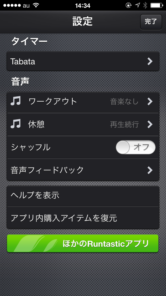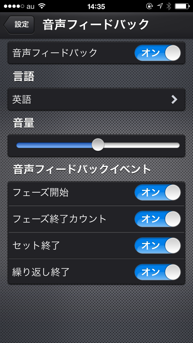 それぞれの準備やワークアウト、休憩は初期設定状態では音声で3秒前からカウントダウンしてくれ、「3、2、1、ワークアウト!」と音声ナビ(フィードバック)をしてくれるほか、残りセット数が1回の場合には、「3、2、1、1セット、ワークアウト!」などと残りセット数も言ってくれるので画面を見なくてもワークアウトを行えるので便利です。