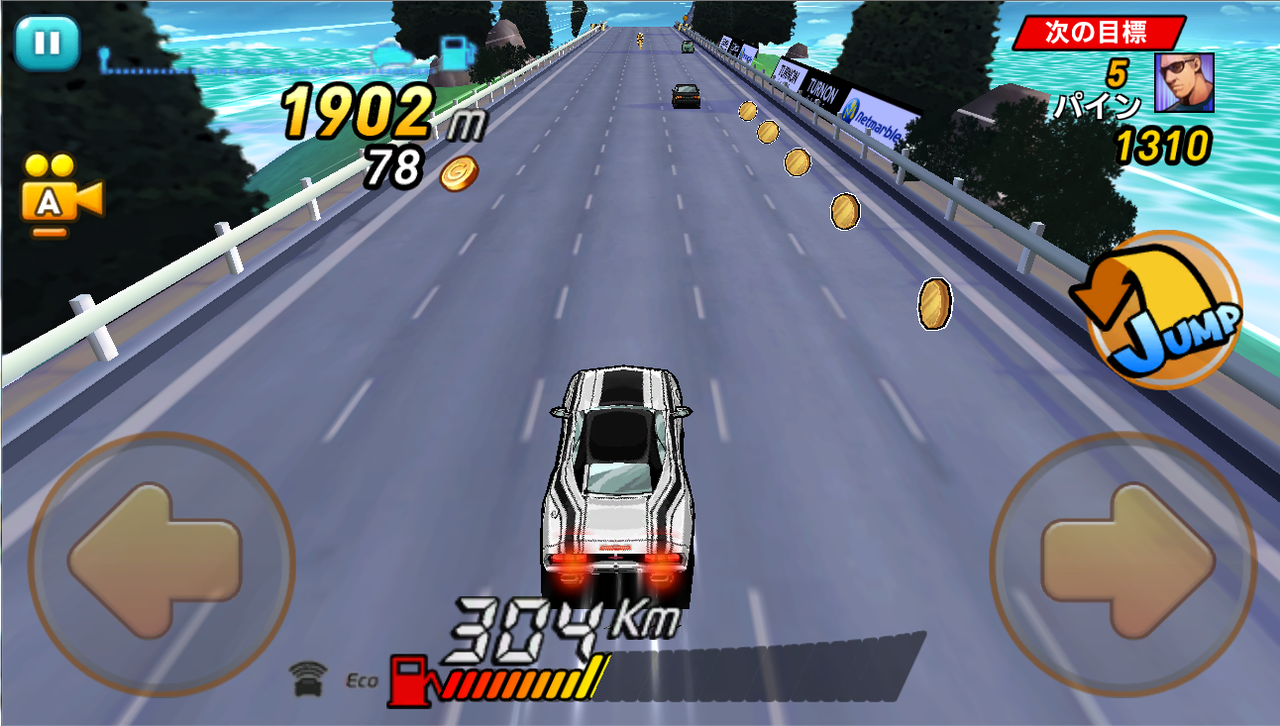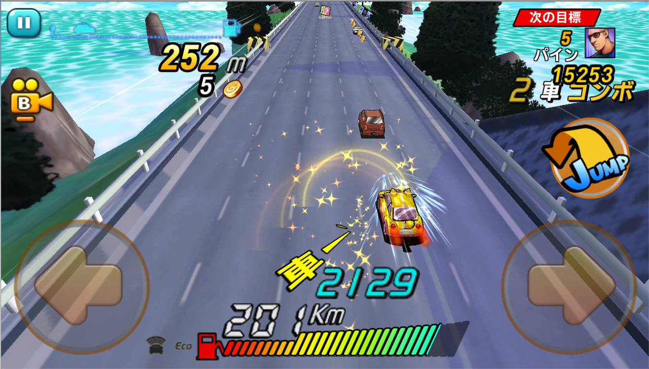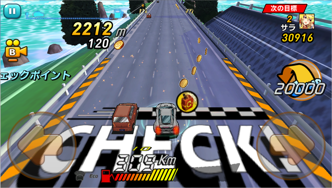 走行中に他の車の後ろに入ることで、空気抵抗が削減されてスピードが上がり、ガソリンの消費を抑えて進むことができます。さらに、ぶつかる直前で車をかわすと「GO!Combo」が発動し、コンボを重ねるごとに変化する「GO!」の掛け声とともにスピードアップして、ボーナススコアも獲得できるので、タイミング良く車をかわすことでハイスコアが狙えます。
