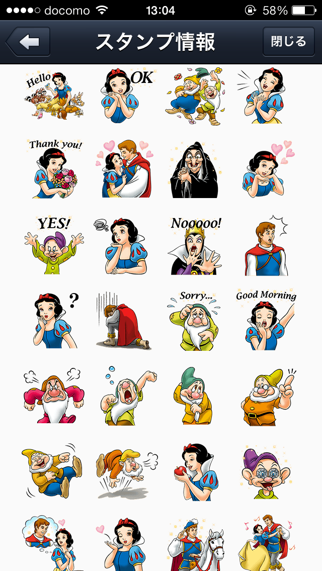 ディズニーのアニメーション映画「白雪姫」がLINEのスタンプになって登場です。キュートな白雪姫、コミカルな7人のこびとや女王(魔女)など個性豊かなキャラクターたちの楽しい表情が沢山詰まっている豪華版スタンプですよ♪