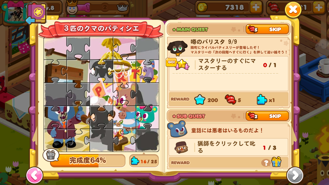 童話の登場人物からの要望(クエスト)を完了するとパズルのピースを獲得することができます。パズルをすべて集めると絵本が完成し、報酬としてゲーム進行に役立つアイテムやゲーム内通貨が獲得できます。
