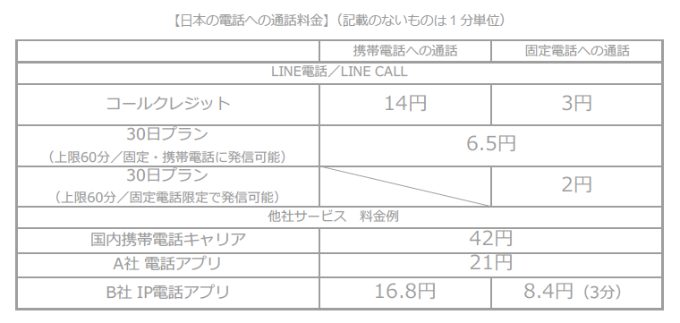 決済方法はLINEアプリ内決済(コールクレジットのみ)もしくは「LINEウェブストア」から購入方法を選べるほか、Androidでは「LINEコイン」を使用しての通話が可能となります。他のサービスなどとの比較も含めた利用料金は以下の通り。