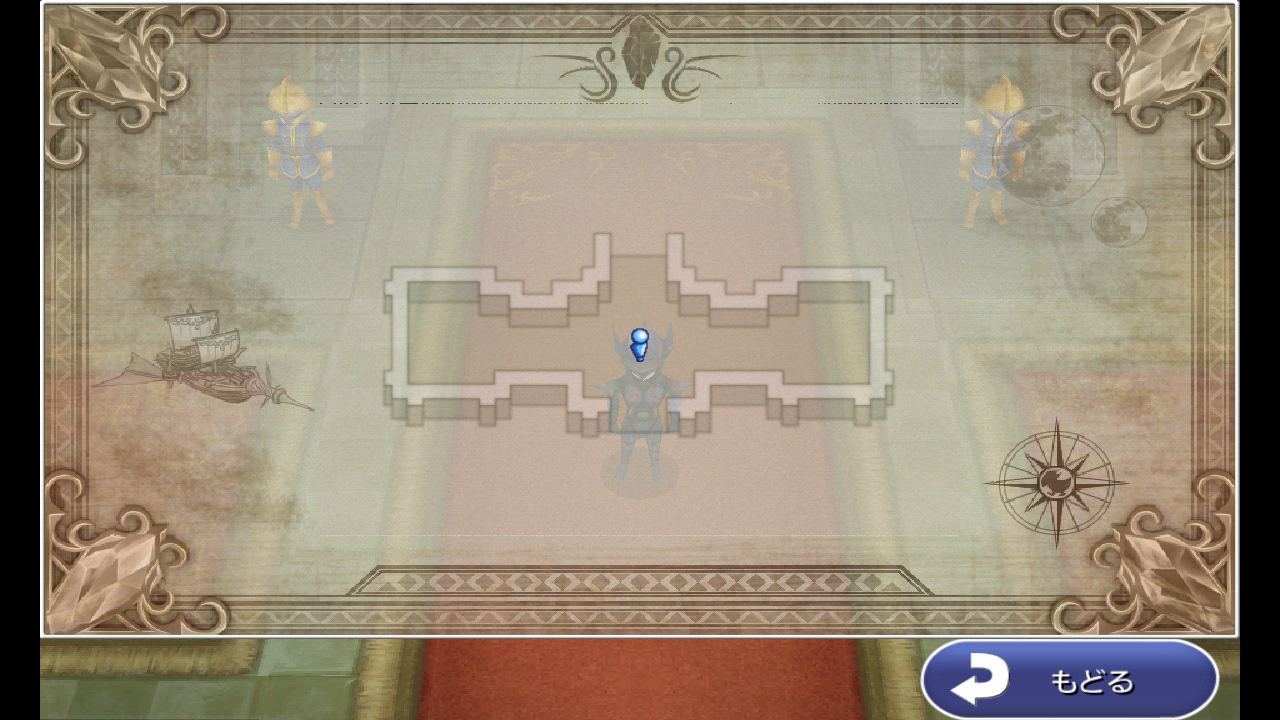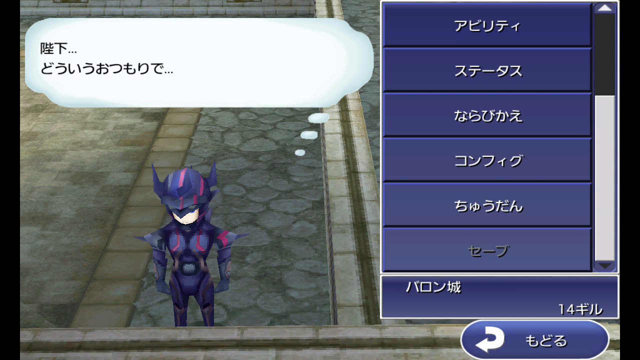 メニューは下にスクロールすると全部で「アイテム」や「まほう」、「そうび」、「アビリティ」、「ステータス」、「ならびかえ」、「コンフィグ」、「ちゅうだん」が並び、その下に場所(バロン城)と持っているお金(14ギル)が表示されています。また、「もどる」をタップすれば、また移動できる状態になります。