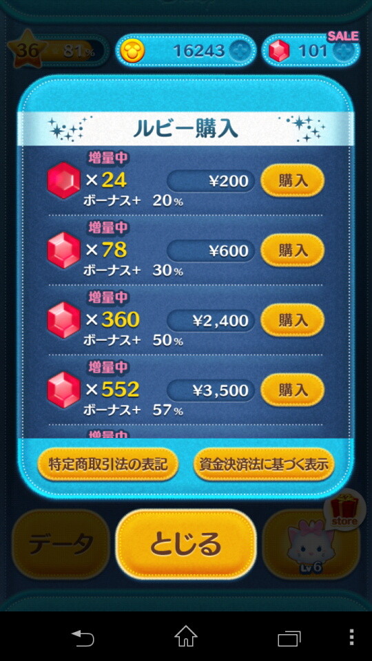 ルビー購入画面でも、「増量中」の文字が表示され、購入すると自動的に通常より20%増しのルビーが獲得できる。