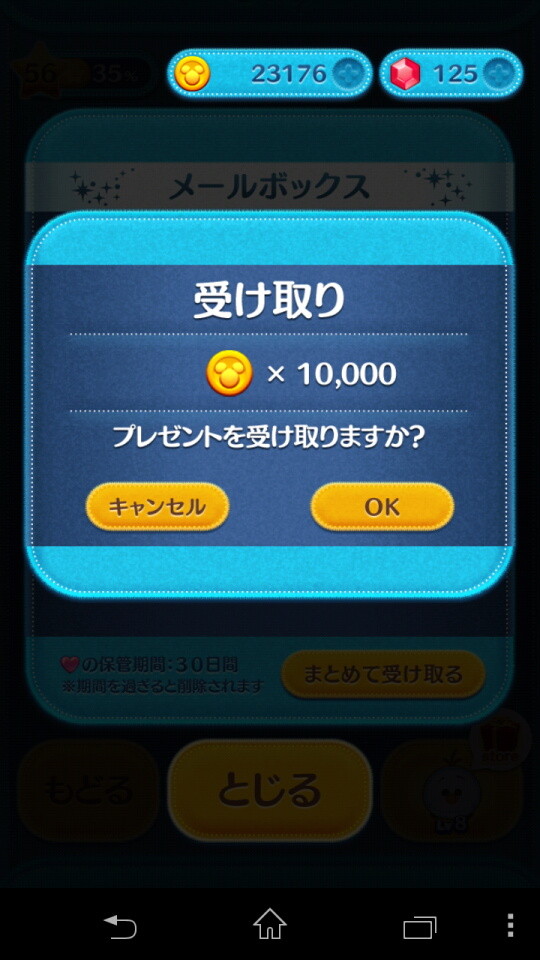 コインを受け取る場合は「OK」を、受け取らない場合は「キャンセル」をタップ