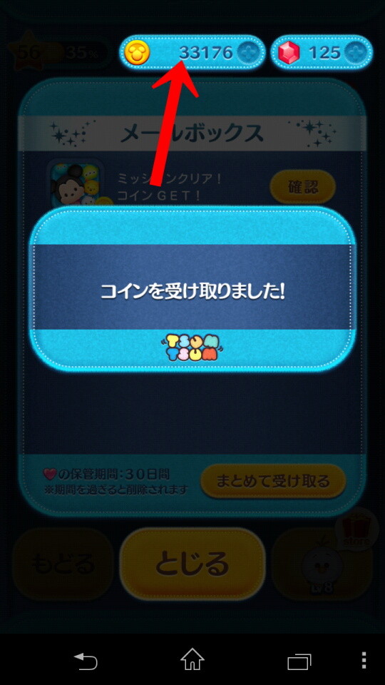 コインを受け取った際は、画面上部のコイン数が加算されているか確認できる