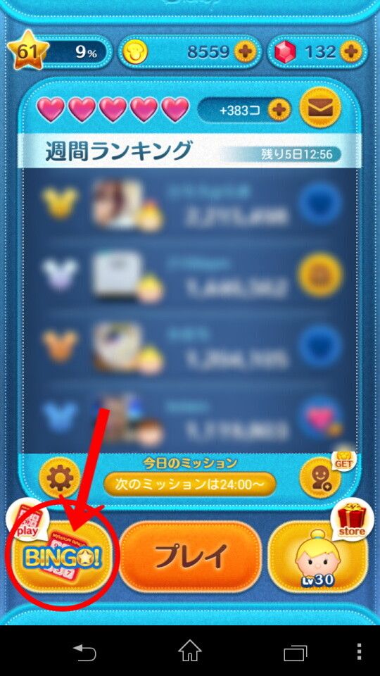 インフォメーション画面を閉じてゲーム画面トップのランキング画面では、左下に「BINGO!」ボタンが新設されている。ミッションビンゴにチャレンジする場合はこのBINGO!ボタンをタップする。