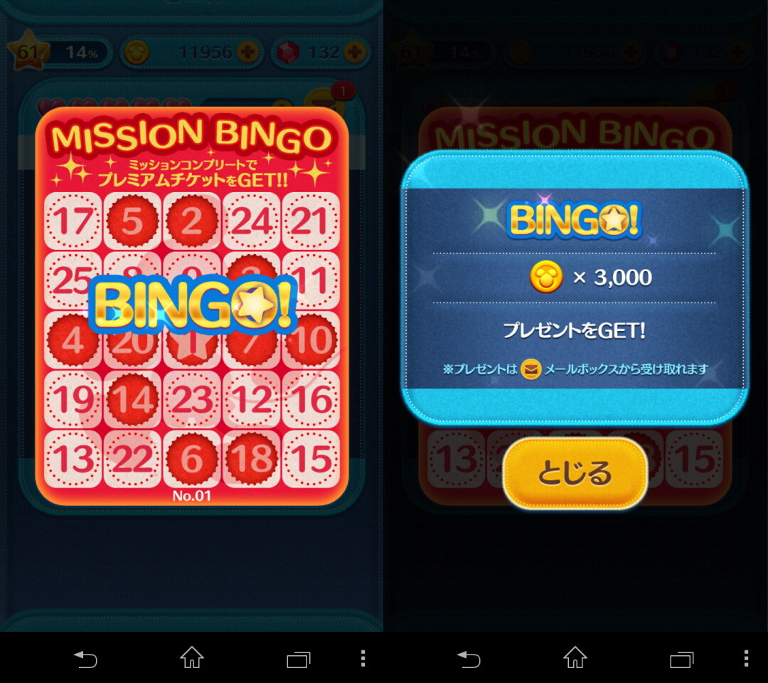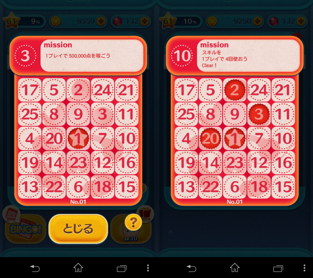 ビンゴ画面では、それぞれの数字をタップするとミッションが表示される。ビンゴ画面を閉じていつも通りプレイをすると、ゲーム終了後に、ビンゴカードが表示されて、クリアしたミッションがあれば自動的にビンゴに穴があいていく。