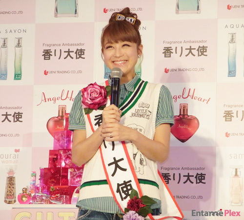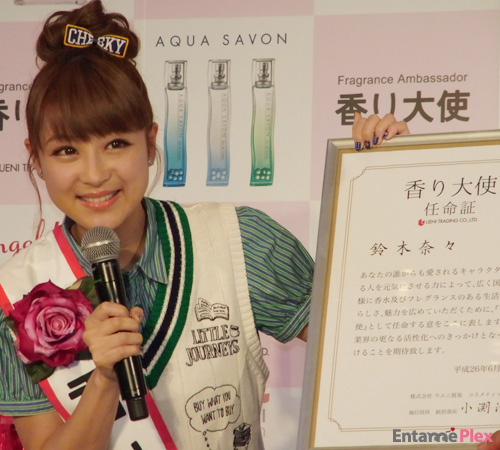 鈴木は、登壇するやいなや「うれしー、うれしー」と連呼し「香水がすごく大好きで中学生のころからつけていたので、“香り大使”に任命していただき香水の素晴らしさや魅力を全力でPRしていきたいです」と元気にアピール。