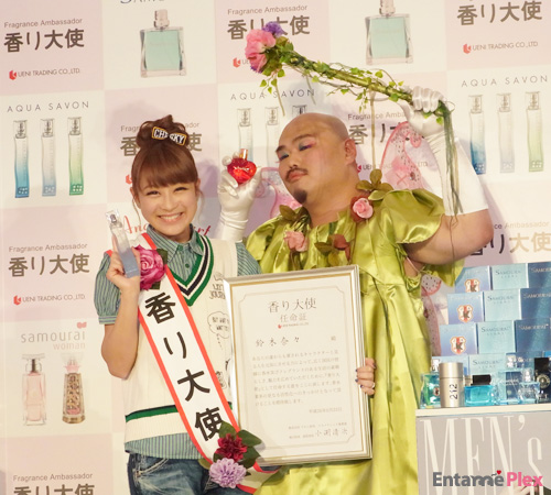 イベント途中には、お笑いトリオ:安田大サーカスのクロちゃんが“香りの妖精”に扮して登場。その怪しい出で立ちに、鈴木は「キモーい」「胡散臭い」と絶叫しながら逃げ惑う姿に会場から笑いが沸き起こった。