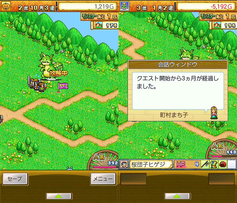 巨大モンスターに立ち向かう戦士たち(写真=左)戦士が弱いと時間が掛かりすぎて資金がマイナスとなりクエストを続けることが困難に……(写真=右)
