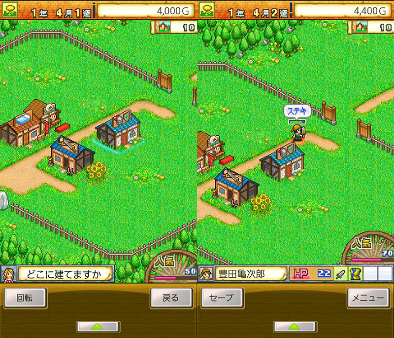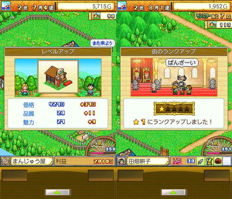 ショップのレベルアップは収入アップにつながります(写真=左)様々な条件を満たすと村もレベルアップし祝福されます(写真=右)
