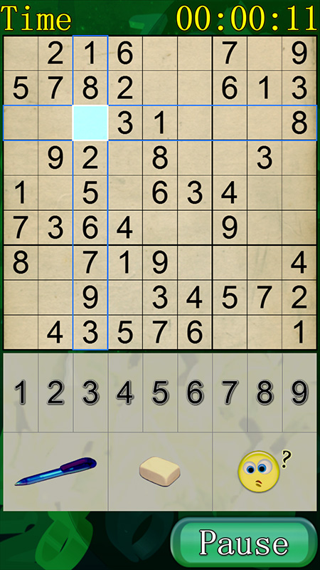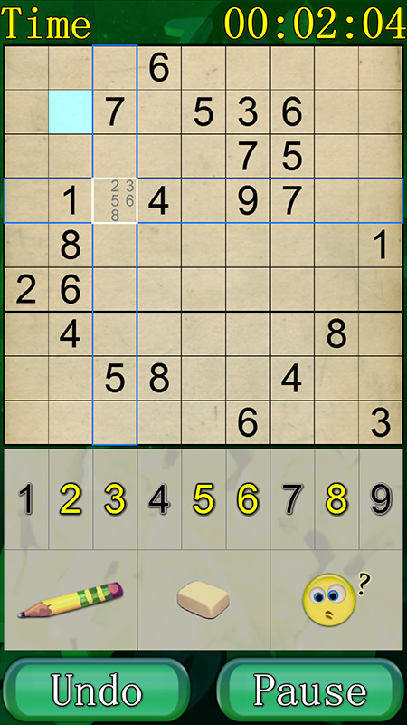 今回は水色のマスの指示通り行ったので「3」だけ残りましたが、場合によっては縦・横の他のマスを見て「3」と「5」が入らないマスをチェックしながら消去法で当てはまる数字を導き出す必要があります。ある程度慣れたら水色のマスをオフ(「Option」→「Best Cell: Off」)にして遊んでみてください。難易度がグッと上がりますよ!