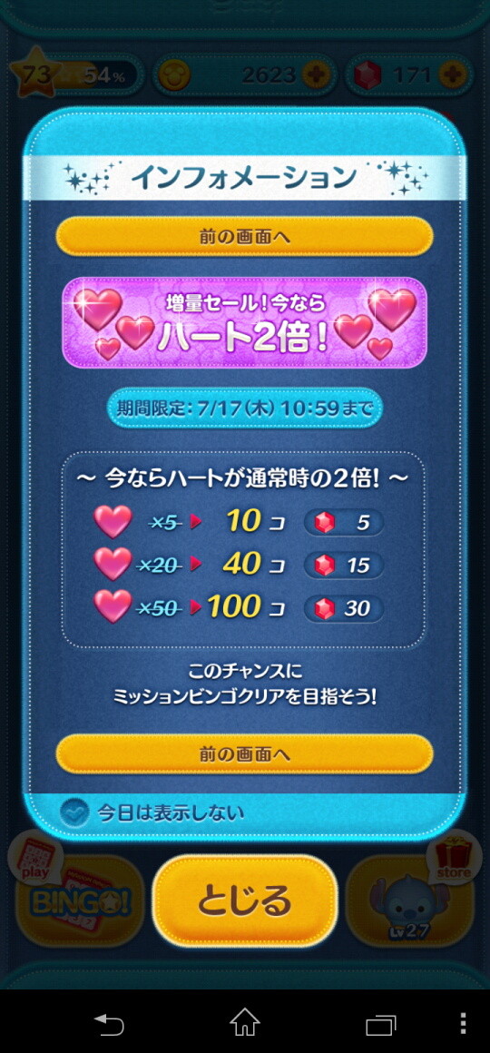 LINE:ディズニー ツムツム、「ミッションビンゴ」に3枚目・4枚目のビンゴカード追加と2枚目の難易度を下げクリアしやすく!ハート2倍の増量セールも実施