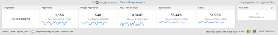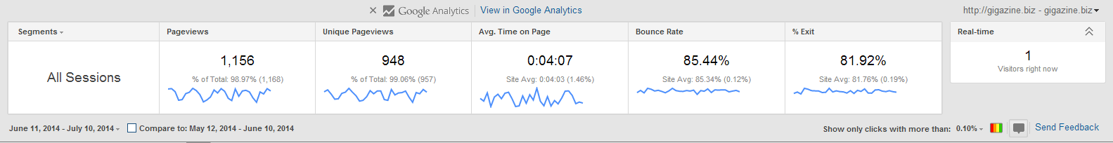 左からページビュー数・ユニークプレビュー数・そのページでの平均的な滞在時間・直帰率・離脱率・リアルタイム来訪者数となっており、各数字が全体のうち何%を占めているか、という表示もされています。なお、デフォルトの場合、数値は直近1カ月のアクセスを解析したもの。