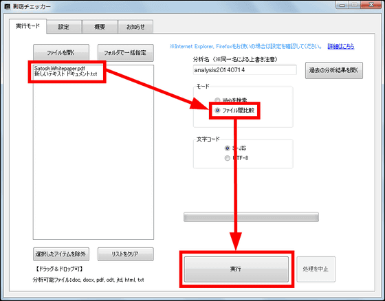 ファイルが一覧に追加されたのを確認後、モード欄を「Webを検索」にして、「実行」をクリック。