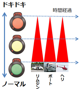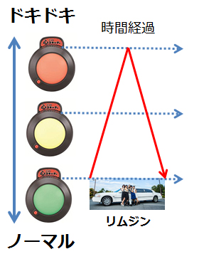 しかしここで不思議な現象がおこる。リムジンで長時間を過ごしているうちに、赤くドキドキしていたランプが、ノーマル状態の緑になることが多くなってきたのだ。図にするとこんな感じになる。一旦赤になるがやがて緑にもどった。