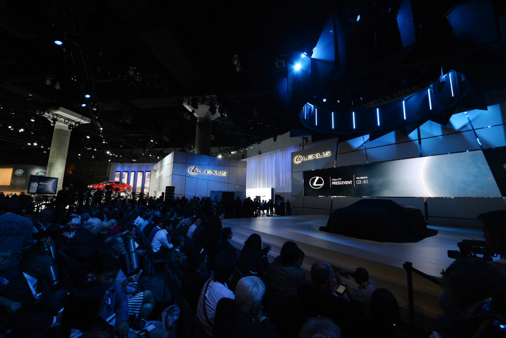 プレスカンファレンス時間には多くの取材者が会場に殺到し会場は満席の上立ち見が展示スペースを大きくあふれています。演壇には、黒いヴェールで覆われた一台の車両のみ。舞台後ろには、日食をイメージする映像が流れます。